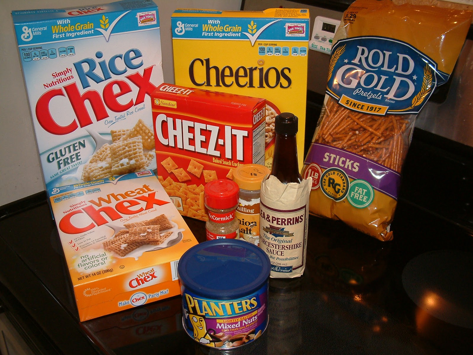 General Mills Rice and Wheat Chex and Cheerios, Rold Gold Pretzel Sticks, Cheez-Its, Lea & Perrins® Worcestershire Sauce, Planters Mixed Nuts, Onion and Celery Salt