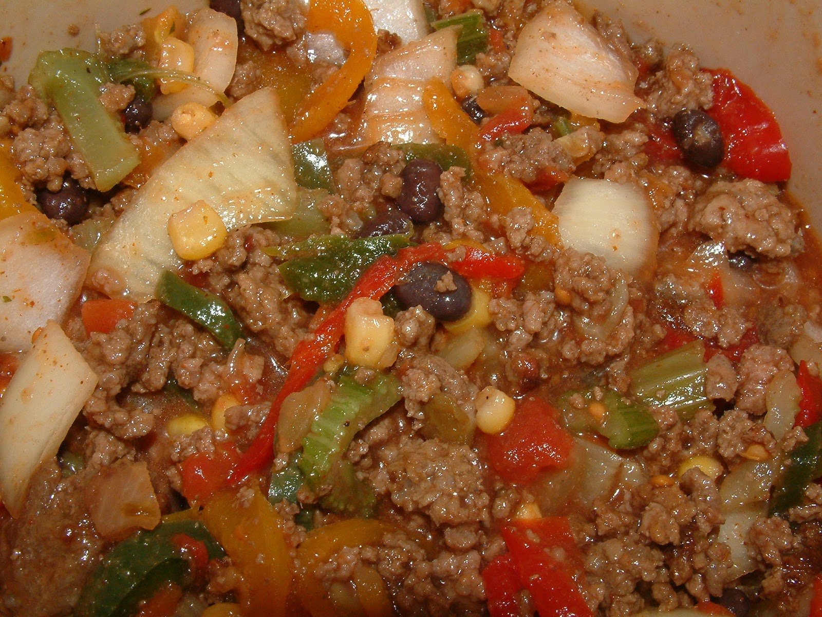 Take cooked hamburger and all other ingredients listed above (except for toppings) and combine in crockpot. Stir well, then cover and cook until heated through 4-6 hours on low.