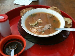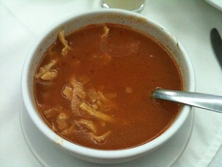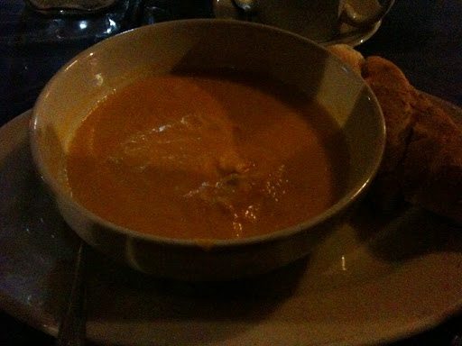 Terrible photo of best soup EVER–in a darkened restaurant, late at night, Carrot Soup in the city of Palenque–so delicious!